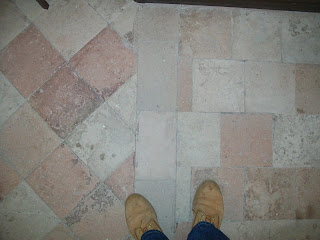 In onze kerk in Montegiorgo keek ik heel even zo naar die tegels, maar al snel nam de verbouwing de overhand. Met een hypotheek op zak, durf je te gaan denken aan het aankopen van tegels. Nadat de kerkdienst was afgelopen, bleef ik even treuzelen en nam toen snel een foto van die vloer. Een mooie combinatie van verschillende kleuren, en twee manieren van leggen.